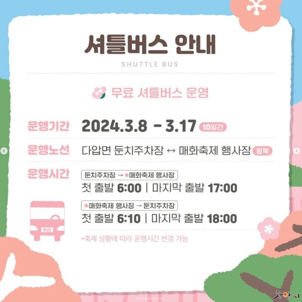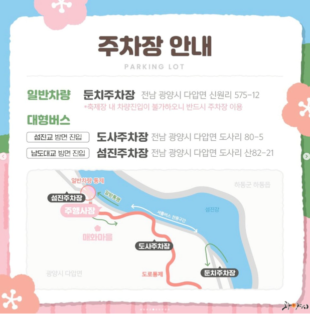 둔치주차장 -> 매화축제 행사장 : 06:00 ~ 17:00