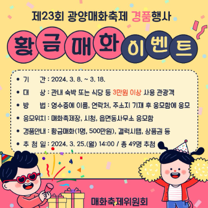 봄의 소식을 알리는 매화축제가 다양한 이벤트를 가지고 진행 중에 있으니 많은 분들의 관심 바랍니다.